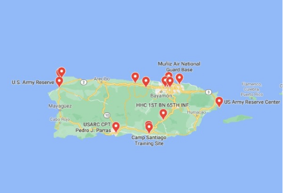 Actualmente, tienen Campamento Santiago, Fort Buchanan, Fort Allen, Base Muñiz, Base Coast Guard, además de otras áreas que llaman de reservas.